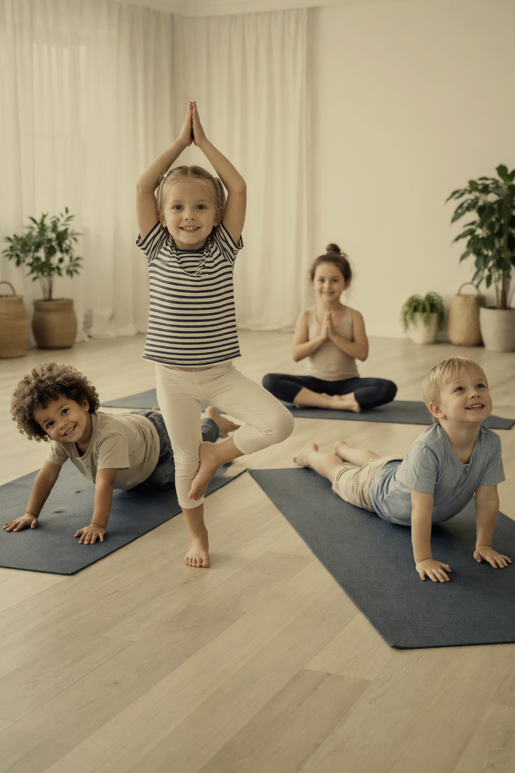 Children practice simple poses and movements that strengthen their coordination and body control.